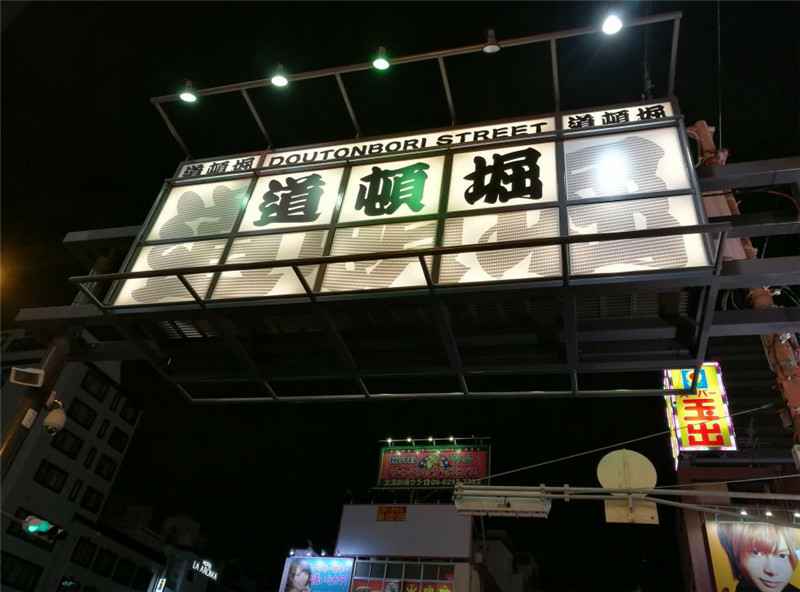 心斋桥 ,道顿崛美食街,大阪美食的代表地点。在这里各种美食的招牌每天都招来川流不息的人潮,最有名的大螃蟹招牌更是道顿崛美食街的标志,尤其是当夜晚来临,闪烁的霓虹灯更是诱人。